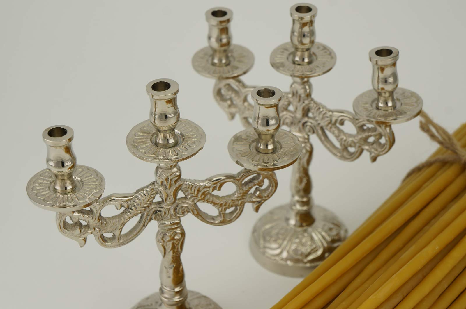 This Set of 2 Nickel-Plated Candle Holders for 3 Candles and 100 Beeswax Candles is a perfect addition to your home prayer altar or icon corner.