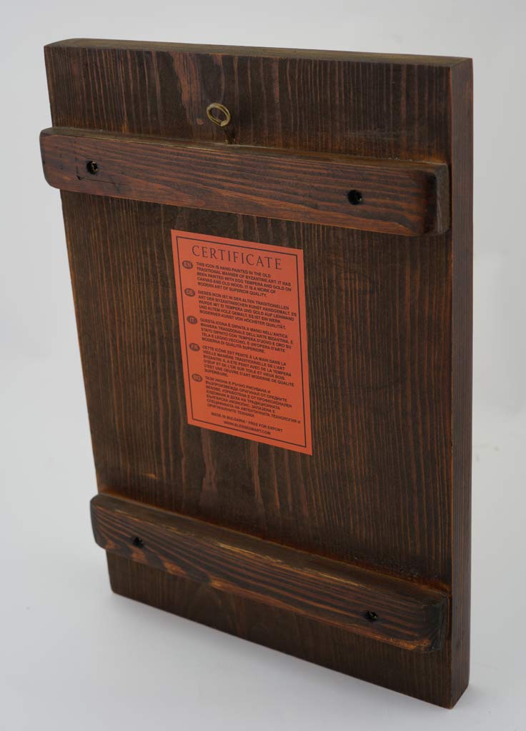 Most of our icons are painted on solid natural wood boards (0.8 inch thick). We offer icons painted on MDF boards as well. The rest of the materials used are strongly individual and depend on the techniques used by every iconographer. In most cases they use tempera, oil or powder paints, varak, gold leaf (foil), varnish and other synthetic materials. Following the Byzantine Art traditions, every icon is layered with a linen cloth, glued and hand sanded to a smooth finish.