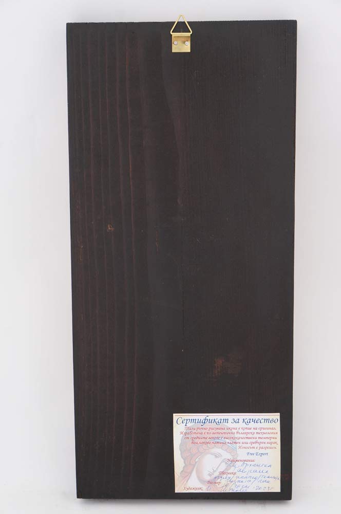 Most of our icons are painted on solid natural wood boards (0.8 inch thick). The rest of the materials used are strongly individual and depend on the techniques used by every iconographer. In most cases they use egg tempera, oil or powder paints, varak, gold leaf (foil), varnish and other materials. Following the Byzantine Art traditions, every icon is layered with a linen cloth, glued and hand sanded to a smooth finish.