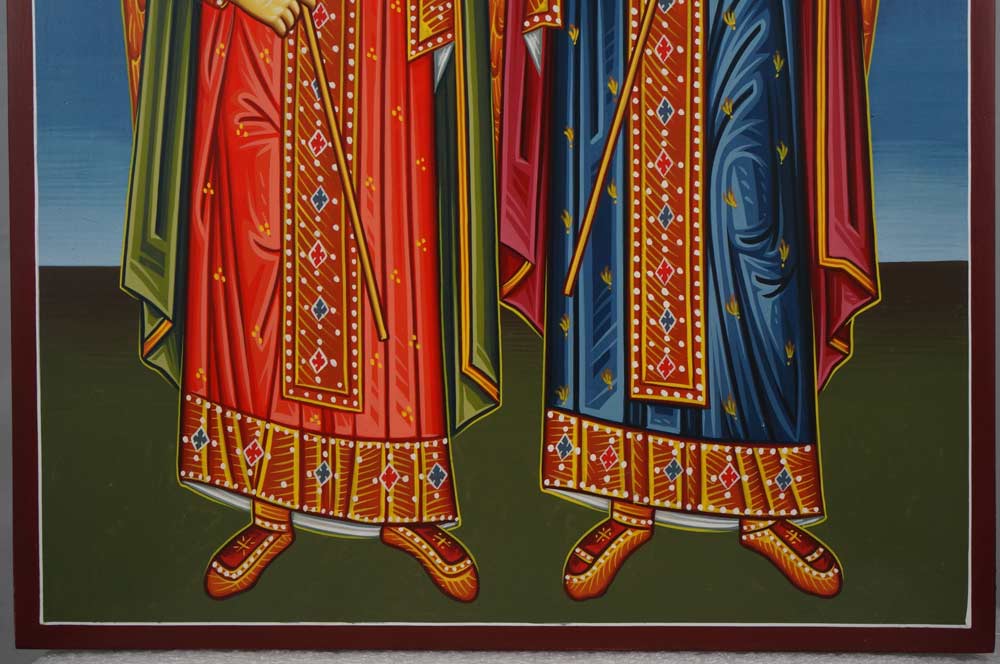Most of our icons are painted on solid natural wood boards (0.8 inch thick). We offer icons painted on MDF boards as well. The rest of the materials used are strongly individual and depend on the techniques used by every iconographer. In most cases they use tempera, oil or powder paints, varak, gold leaf (foil), varnish and other synthetic materials. Following the Byzantine Art traditions, every icon is layered with a linen cloth, glued and hand sanded to a smooth finish.