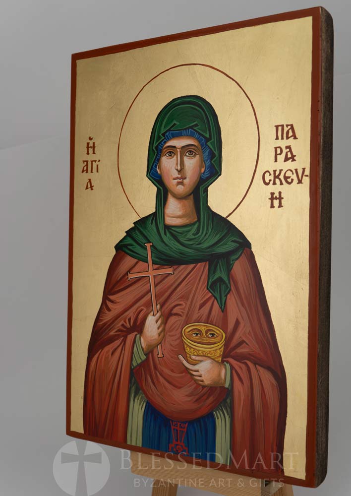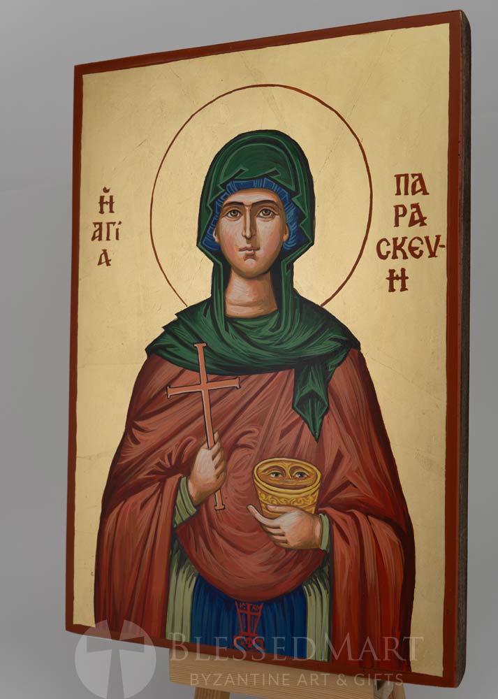 This hand-painted Orthodox icon depicts Saint Paraskevi of Rome (also known as Paraskeva, Parascheva, Petka), the 2nd-century virgin martyr who devoted her life to Christ through prayer, preaching, and healing. She is especially venerated in Greece and the Balkans as a patroness of the eyes and healer of illnesses, as well as a protector of families and communities. In iconography, she is often shown holding a cross or a scroll as a witness to her faith.