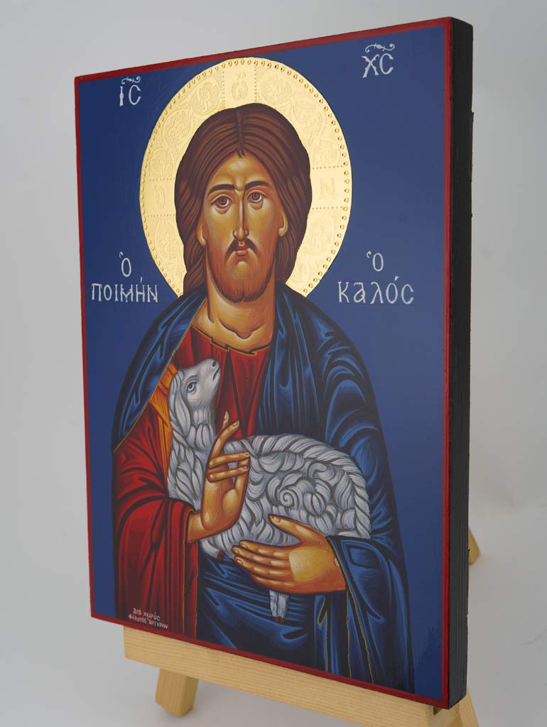 Hand-painted Greek Orthodox icon of Jesus Christ the Good Shepherd (polished gold halo). We take time and carefully photograph each icon. Please check out all the photos. The icon features a metal hook for hanging.