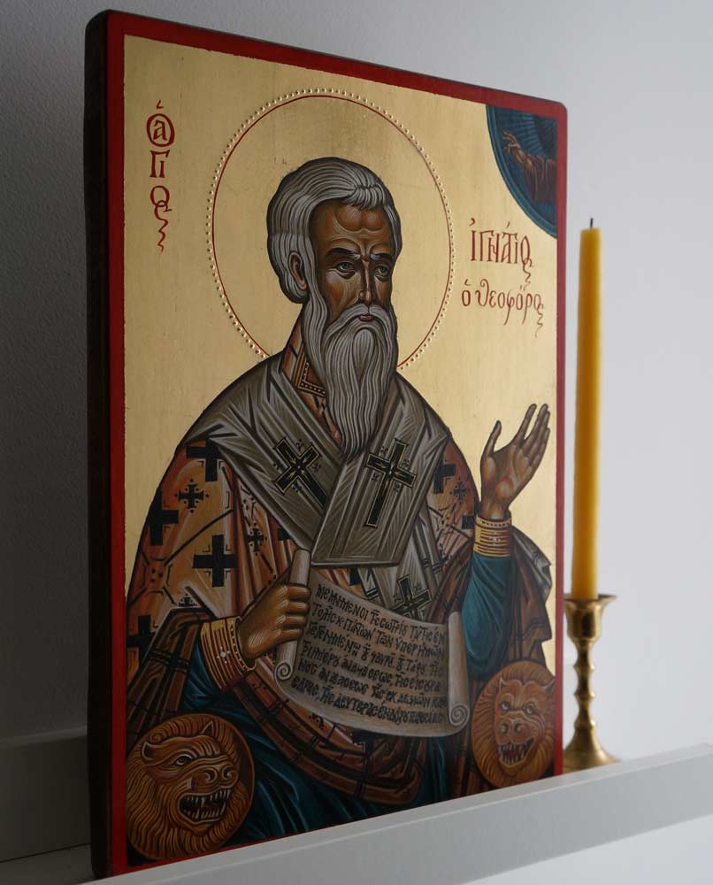 Saint Ignatius of Antioch – Hand-painted (written) icon by Plamen Kazakov. The scroll reads:Â “With the Rememberance of this salvational order and all things that happened for us, which is the cross, grave, three days of Ressurection, Ascension in the Sky, the taken position right of the father and the glorious second coming”