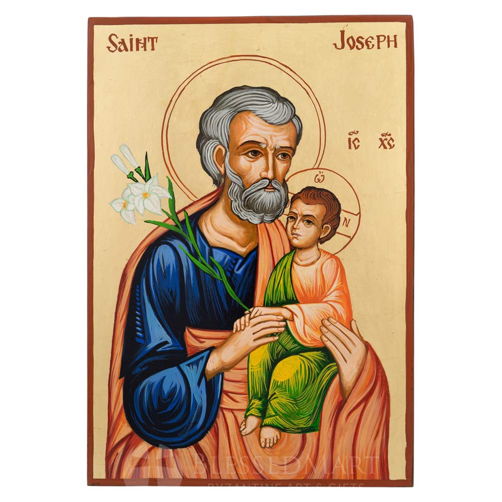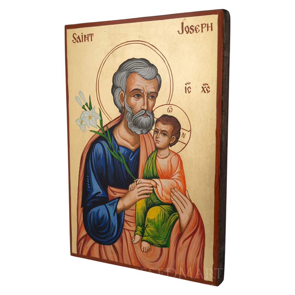 This hand-painted icon depicts Saint Joseph the Betrothed (also known as Joseph the Righteous, Joseph the Carpenter), the guardian and protector of the Holy Family. In this image, Saint Joseph is shown with white lilies or flowers, a symbol of purity, righteousness, and his chaste life as the chosen protector of the Virgin Mary and the Christ Child. He is honored in both the Orthodox and Catholic traditions as a model of humility, obedience, and fatherly care.