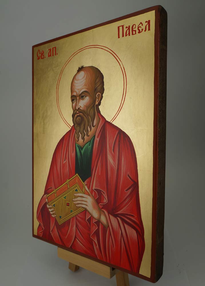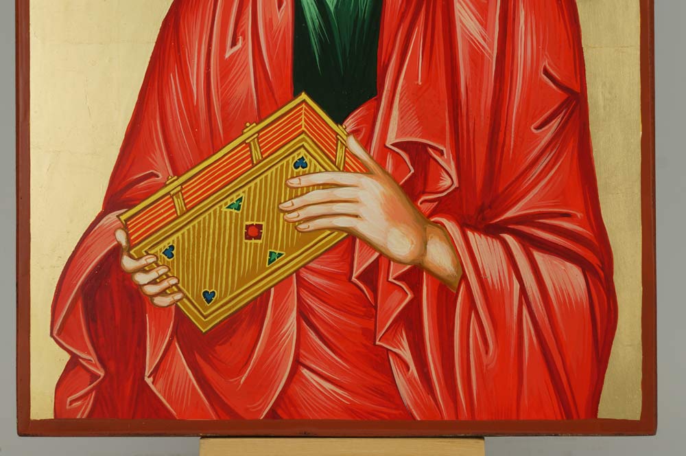 Most of our icons are painted on solid natural wood boards (0.8 inch thick). We offer icons painted on MDF boards as well. The rest of the materials used are strongly individual and depend on the techniques used by every iconographer. In most cases they use tempera, oil or powder paints, varak, gold leaf (foil), varnish and other synthetic materials. Following the Byzantine Art traditions, every icon is layered with a linen cloth, glued and hand sanded to a smooth finish.