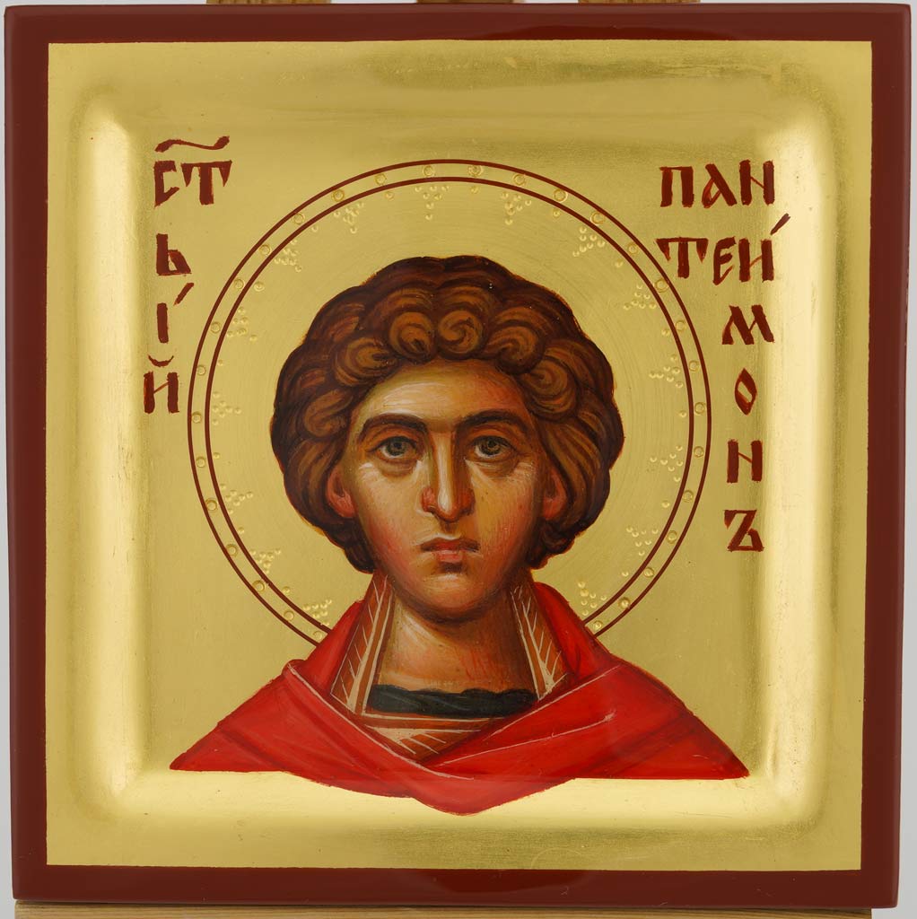 Beautiful hand-painted miniature icon of St Panteleimon – This is a premium quality mini icon made with pure 23kt gold leaf. Painted using traditional technique – egg tempera, solid lime wood panel, varnish, 23 karat gold leaf.