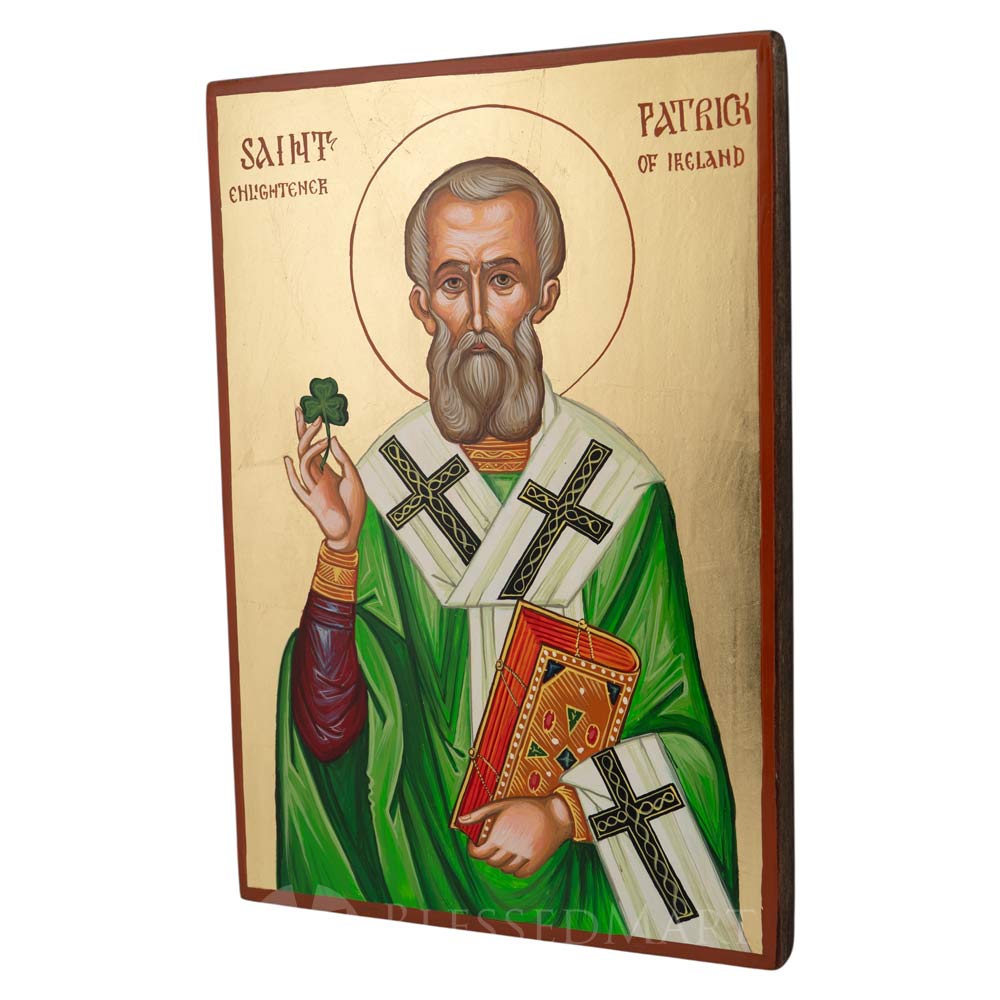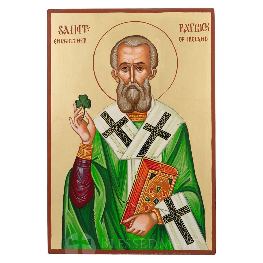 This hand-painted Orthodox icon depicts Saint Patrick of Ireland (also spelled Patrikios, Padraig), the Equal-to-the-Apostles and Bishop of Armagh. Born in Britain in the 4th century, he was enslaved in Ireland, later escaped, and returned as a missionary. Through his preaching and miracles, he converted the Irish people to Christianity and is revered as the Enlightener of Ireland. In iconography, he is often shown with a bishop’s staff and shamrock, symbolizing the Holy Trinity.