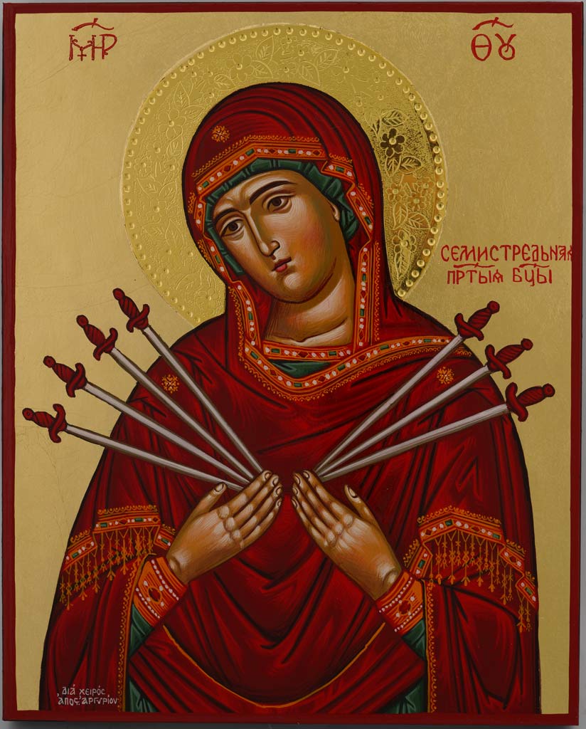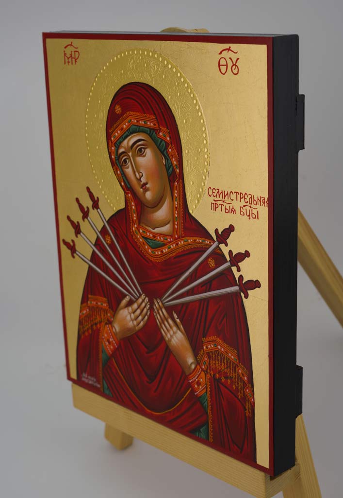 Hand-painted Orthodox icon of Mother of God of the Seven Arrows. The icon features a 24-karat polished and decorated halos. We take time and carefully photograph each icon. Please check out all the photos. The icon features a metal hook for hanging.