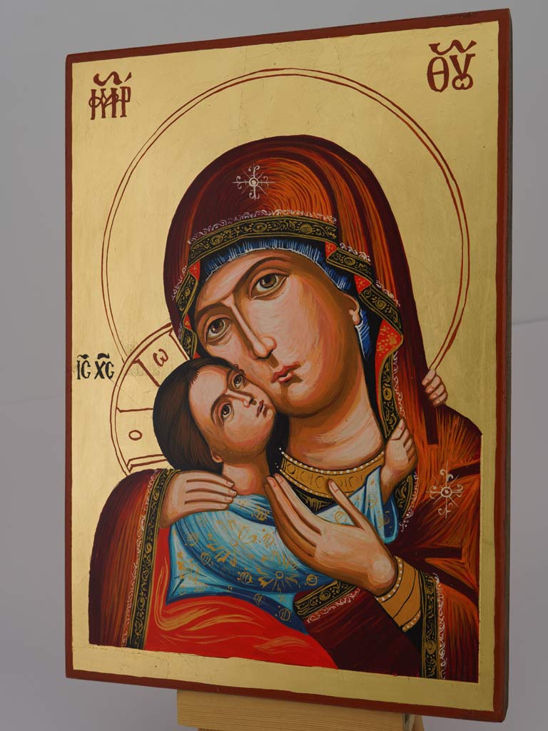 Most of our icons are painted on solid natural wood boards (0.8 inch thick). We offer icons painted on MDF boards as well. The rest of the materials used are strongly individual and depend on the techniques used by every iconographer. In most cases they use tempera, oil or powder paints, varak, gold leaf (foil), varnish and other synthetic materials. Following the Byzantine Art traditions, every icon is layered with a linen cloth, glued and hand sanded to a smooth finish.