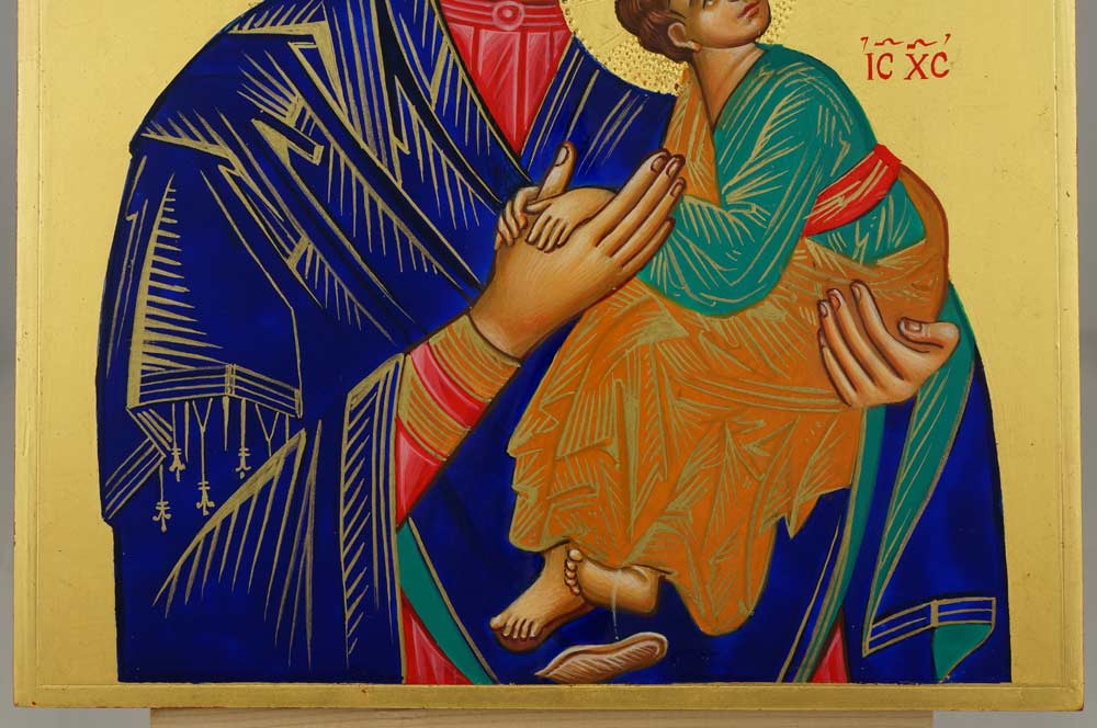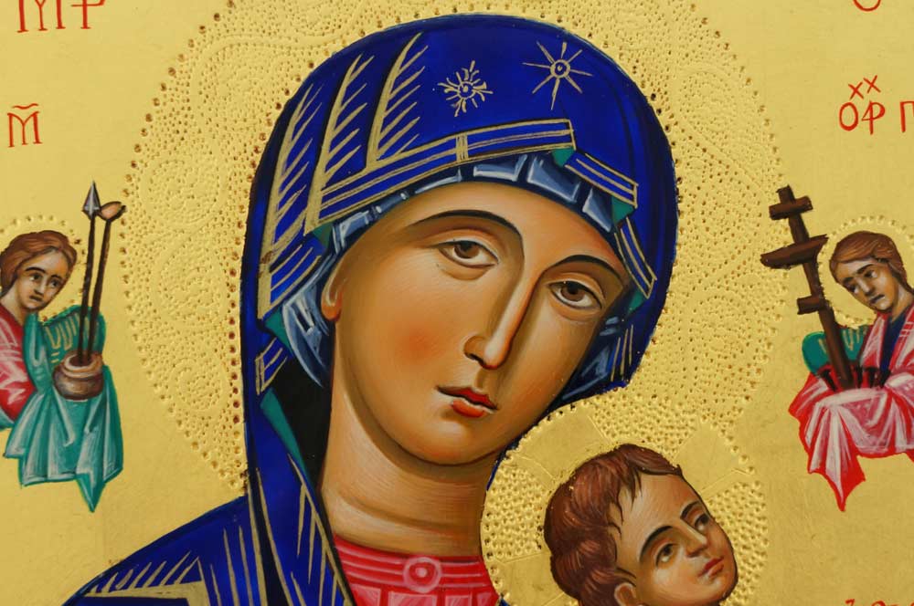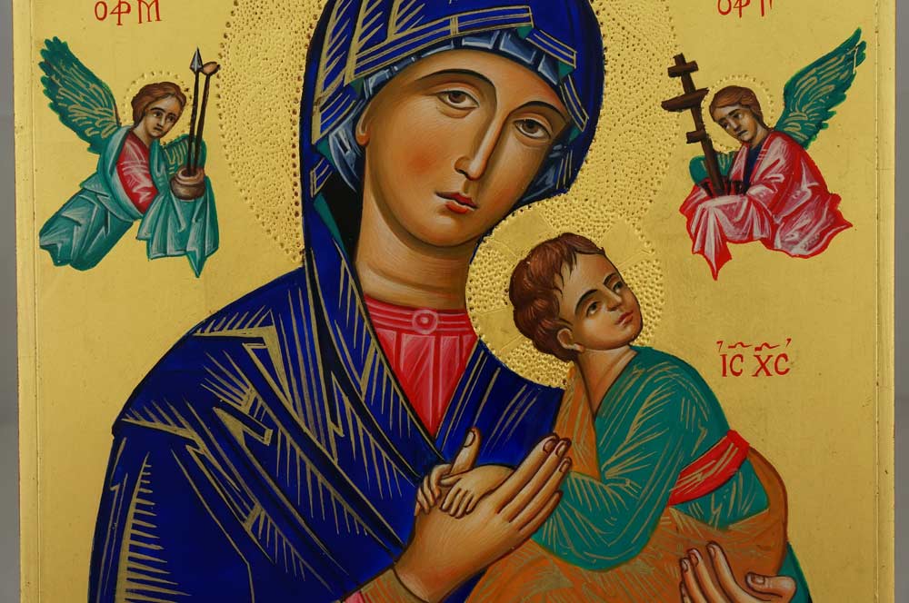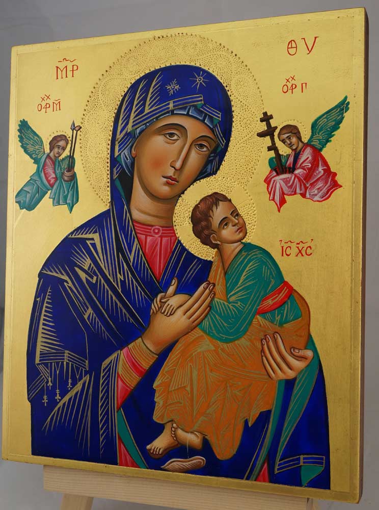 Hand-Painted icon of Our Lady of Perpetual Help (OLPH) – This is a premium quality icon made with pure 23K gold leaf. Painted using traditional technique – egg tempera, lime wood panel with slats on the back, varnish, 23 karat gold leaf.