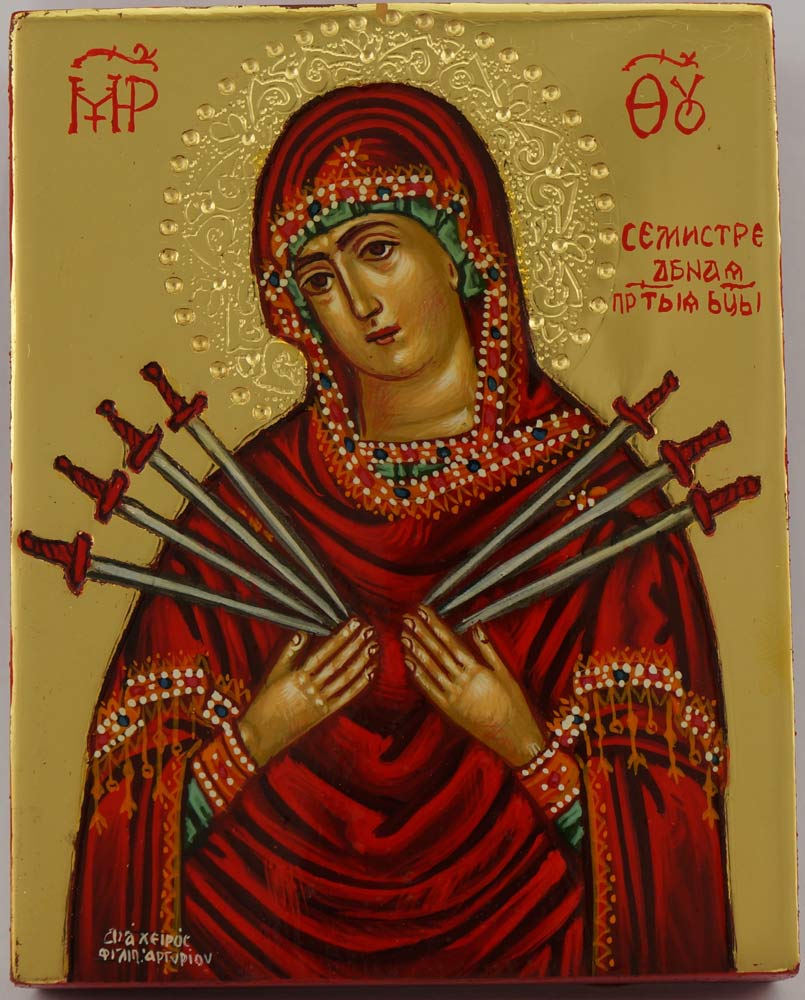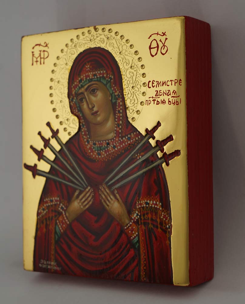 Softener of Evil Hearts (polished gold miniature). Theotokos Seven Swords / Arrows icon – this hand-painted icon features genuine 24kt polished gold and hand-engraved decorations.