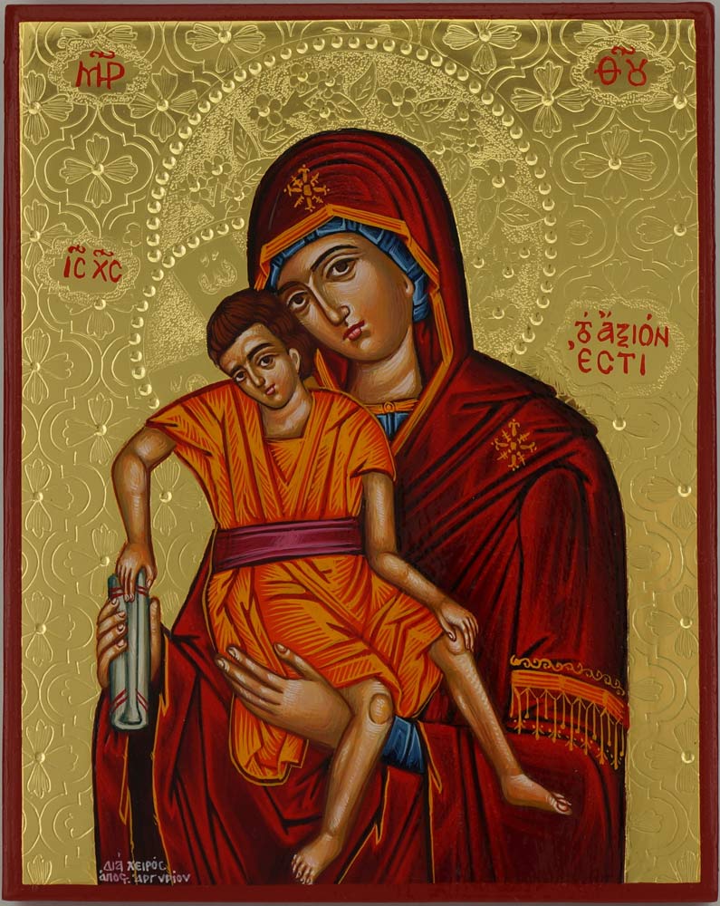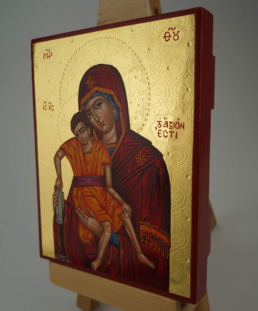 Theotokos Axion Esti Icon (polished gold) – this hand-painted icon features genuine 24kt polished gold and hand-engraved decorations.