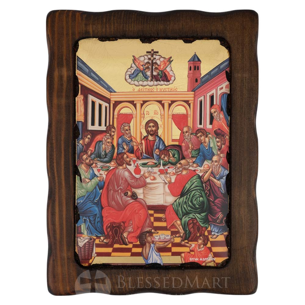 The Mystical Supper Icon (also known as the Last Supper) depicts Christ seated with His disciples in the Upper Room on the night before His Passion. He blesses the bread and wine, instituting the Holy Eucharist. The Apostles are gathered around the table, with Judas often shown reaching toward the dish, symbolizing his betrayal. This icon is central to Orthodox teaching on the Divine Liturgy, where the faithful partake of Christ’s Body and Blood.