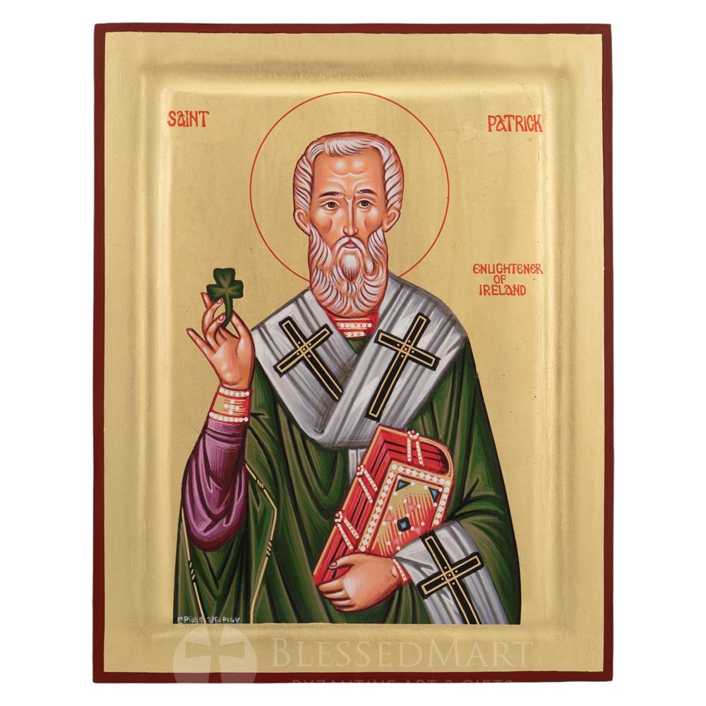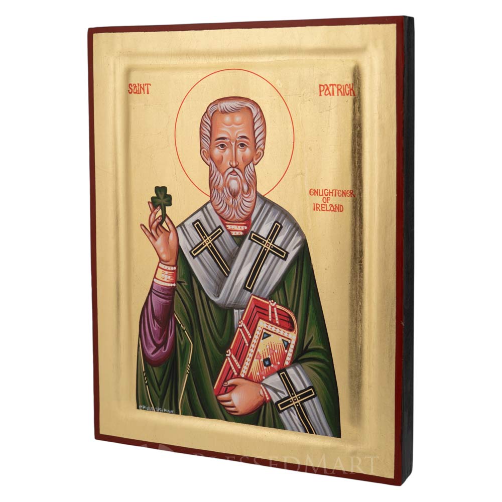 The icon depicts St Patrick of Ireland (also known as Padraig, Patricius), honored in both the Orthodox and Catholic Church as the Apostle and Enlightener of Ireland. He is shown in episcopal vestments, often holding a Gospel or cross. In some depictions, he holds a shamrock, symbolizing how he explained the mystery of the Holy Trinity to the Irish people.