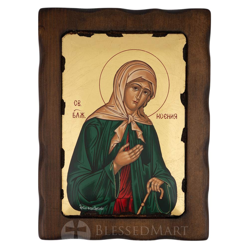 The icon depicts Saint Xenia of Petersburg (also known as Ksenia, Kseniya), an 18th-century Russian saint revered as a Holy Fool for Christ. After the death of her husband, she gave away her possessions and lived a life of voluntary poverty and humility, wandering the streets of St Petersburg in prayer. Through her holy life, she became known for interceding for the poor, the suffering, and those in need of work or family blessings.