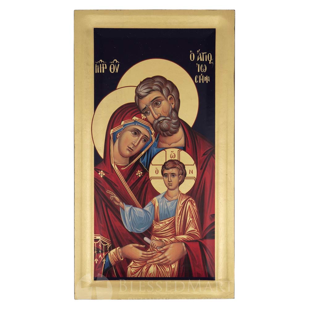 The Holy Family Icon portrays the Virgin Mary, the Christ Child, and Saint Joseph the Betrothed united in peace and divine love. In this depiction, the Mother of God holds the Child tenderly, while Saint Joseph stands beside them, symbolizing faith, care, and protection. Sometimes he is shown holding a white lily, a sign of purity, or two doves, representing love and the Holy Spirit.