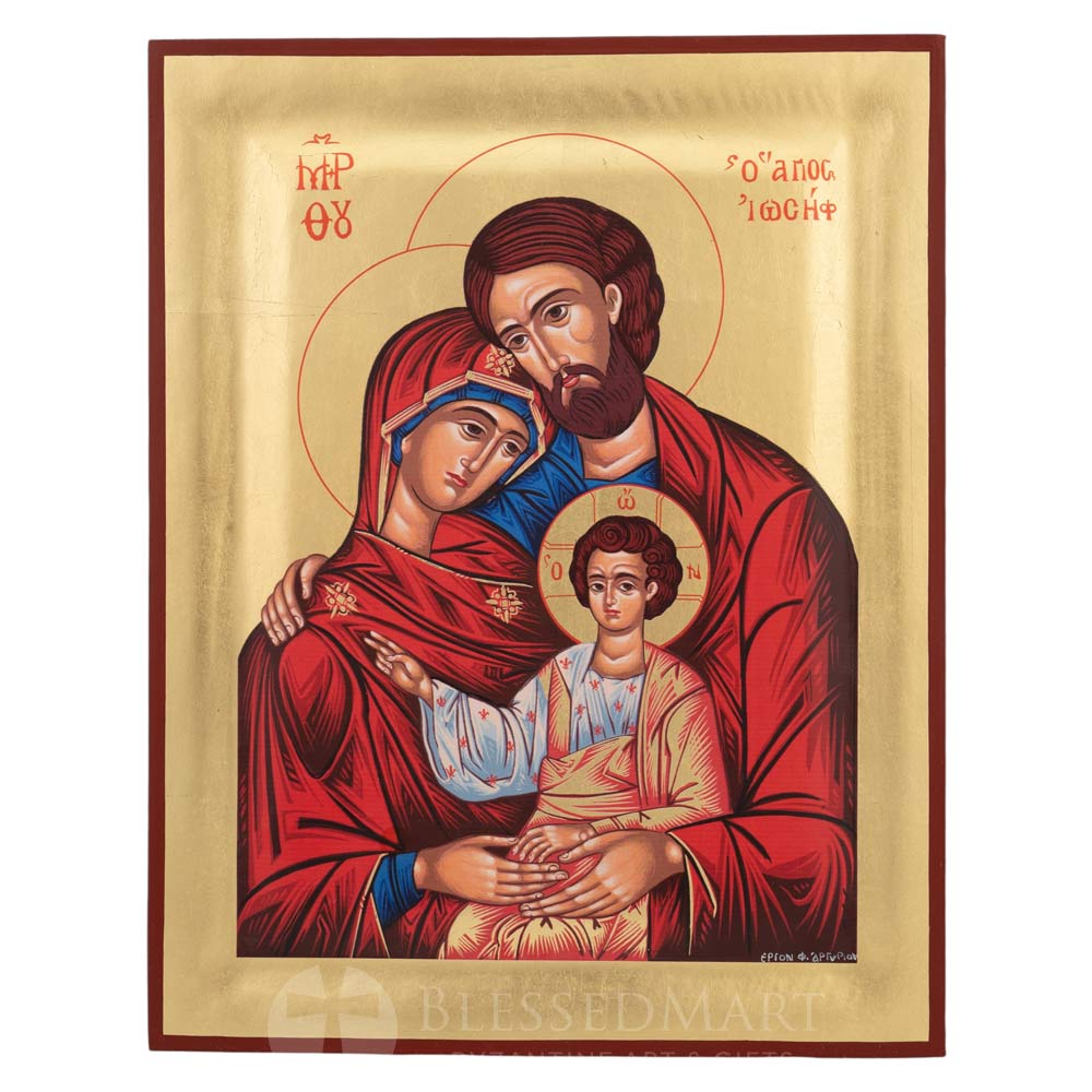Handmade Greek Orthodox icon of the Holy Family – This is a premium quality silkscreen icon handmade with gold leaf on canvas and solid natural wood.