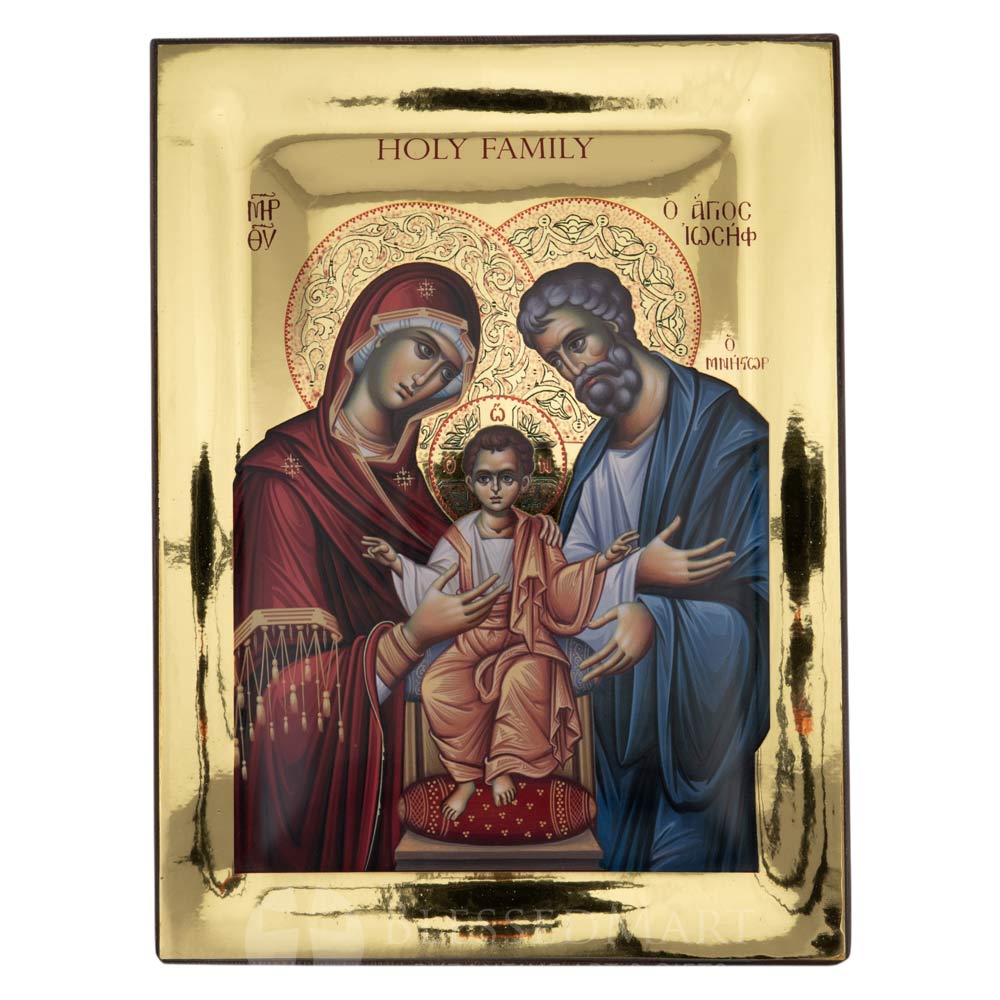 The Holy Family Icon depicts the Virgin Mary, Christ Child, and Saint Joseph the Betrothed — a symbol of divine love, unity, and obedience to God’s will. The Mother of God gently holds the Child, while Saint Joseph is often shown in the background, holding white lilies, a sign of purity and faithfulness, and sometimes two doves, representing peace and the Holy Spirit.