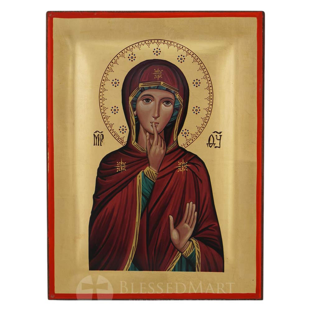 This is a silkscreen reproduction with gold leaf and hand-painted details, crafted according to tradition. It depicts the Our Lady of Silence devotion, a Catholic Marian image that invites the faithful into prayer, silence, and interior peace. The Virgin Mary is shown with her finger raised to her lips, a gesture calling to contemplation, humility, and reverence before God.