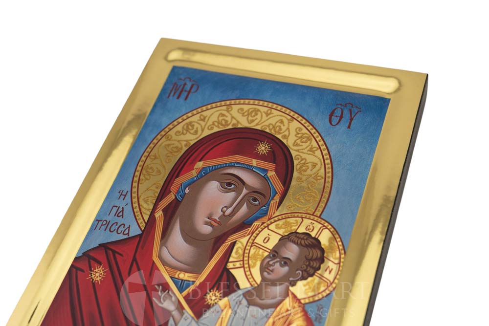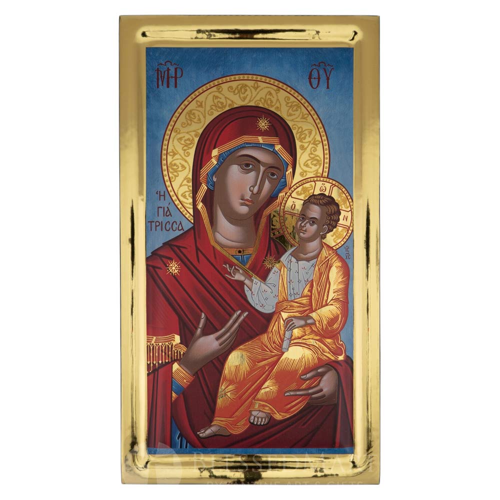 The Theotokos Giatrissa the Healer Icon (Greek: Παναγία Γιάτρισσα, meaning “Healing Mother of God”) depicts the Virgin Mary holding the Christ Child, who blesses with His right hand and holds a scroll — symbol of divine wisdom and healing grace.
