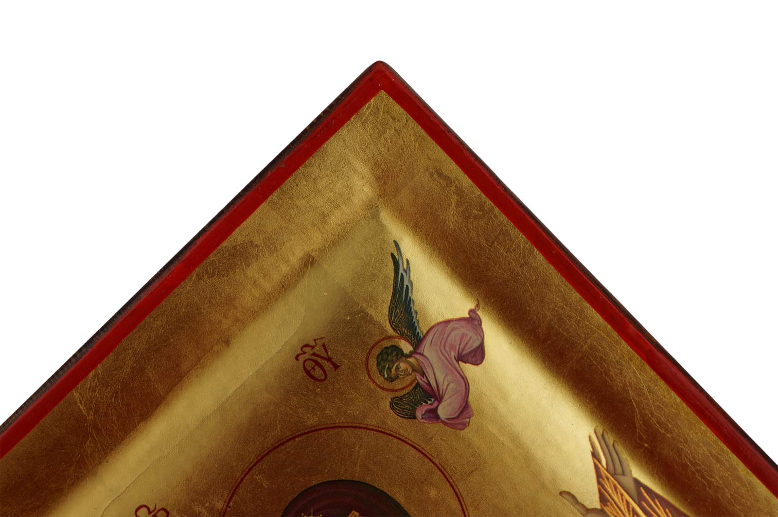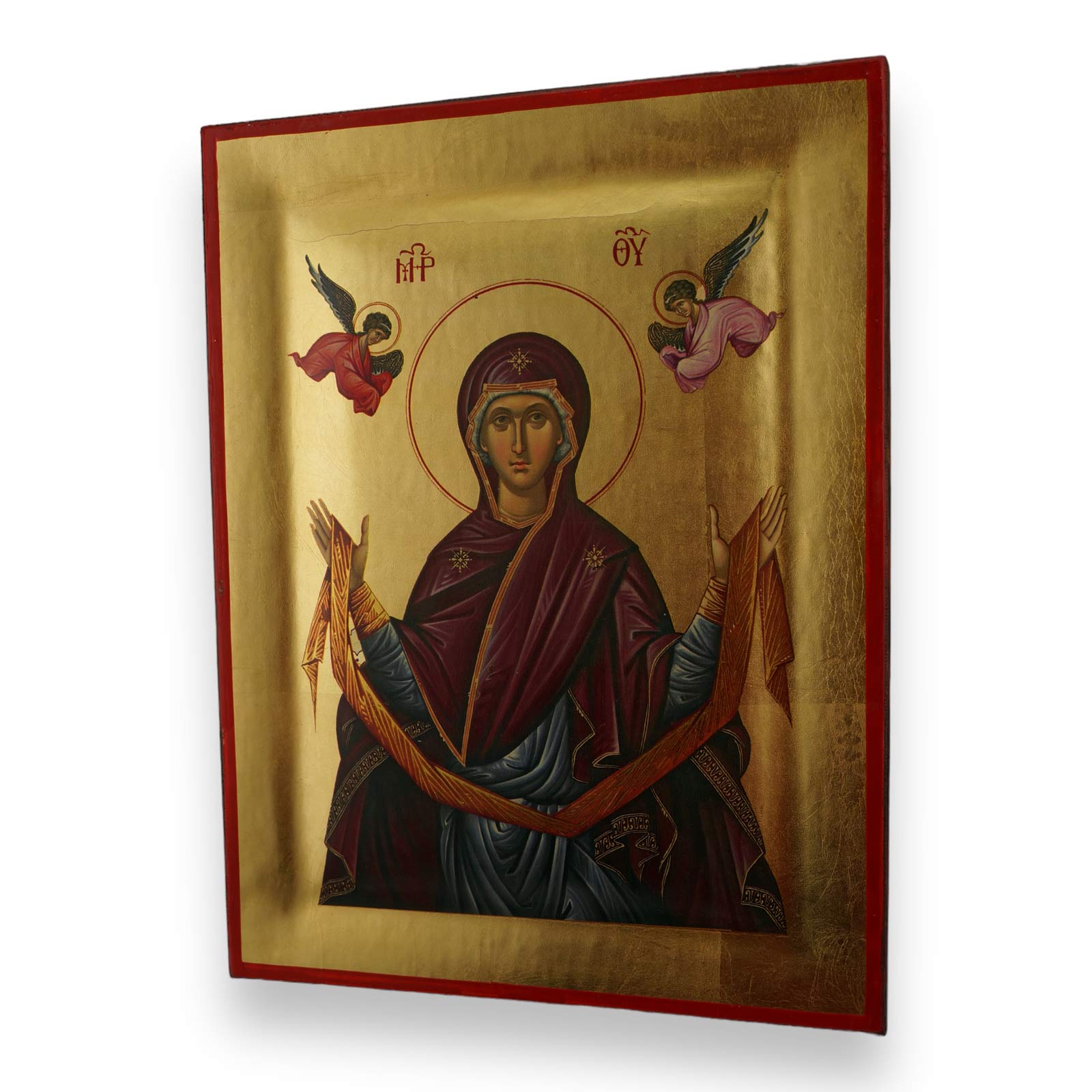 Handmade Greek Orthodox icon of Theotokos Holy Belt (Zoni) – This is a premium quality silkscreen icon handmade with gold leaf on canvas and solid wood.