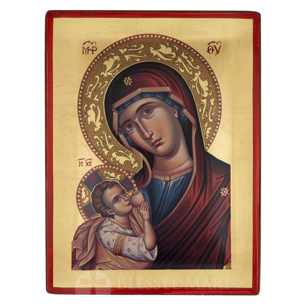 This is a silkscreen reproduction with gold leaf and hand-painted details, crafted according to tradition. It depicts the Theotokos Galaktotrophousa (Milk Giver), one of the most tender and rare Marian icon types. The Mother of God is shown nursing the Christ Child, emphasizing her true humanity, maternal care, and the Incarnation of the Son of God.