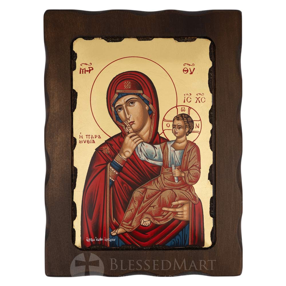 The icon depicts the Theotokos Paramythia (Our Lady of Consolation). The Virgin gently restrains Christ’s hand as He blesses, symbolizing her intercession and His mercy. Above her head are the letters MP ΘΥ (Mother of God); beside Christ appear IC XC (Jesus Christ); His halo bears Ω Ο Ν (He Who Is), affirming His divinity.