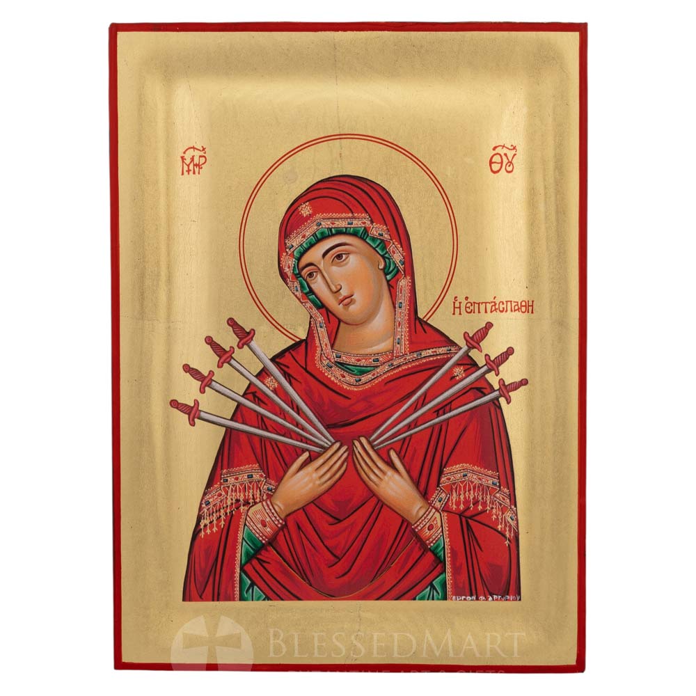 The Theotokos Softener of Evil Hearts (also known as the Prophecy of Simeon Icon or the Seven Swords Icon) is one of the most beloved Marian icons in the Orthodox Church. The Virgin Mary is shown with seven swords piercing her heart, symbolizing the prophecy of St Simeon in the Temple: “a sword shall pierce through your own soul also” (Luke 2:35).